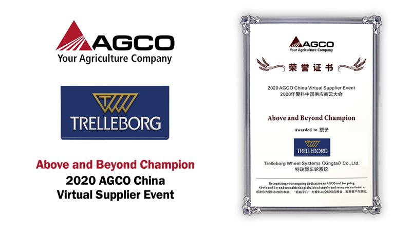 近日,特瑞堡车轮系统中国团队在2020年爱科线上供应商大会中荣获“超越平凡”供应商大奖。爱科是农业机械设备与解决方案的设计、制造、销售的全球领导者。该奖项为表彰特瑞堡对保障全球粮食安全供应和全心服务客户的承诺和践行,以及作为爱科顶级供应商在特殊时期的卓越贡献。